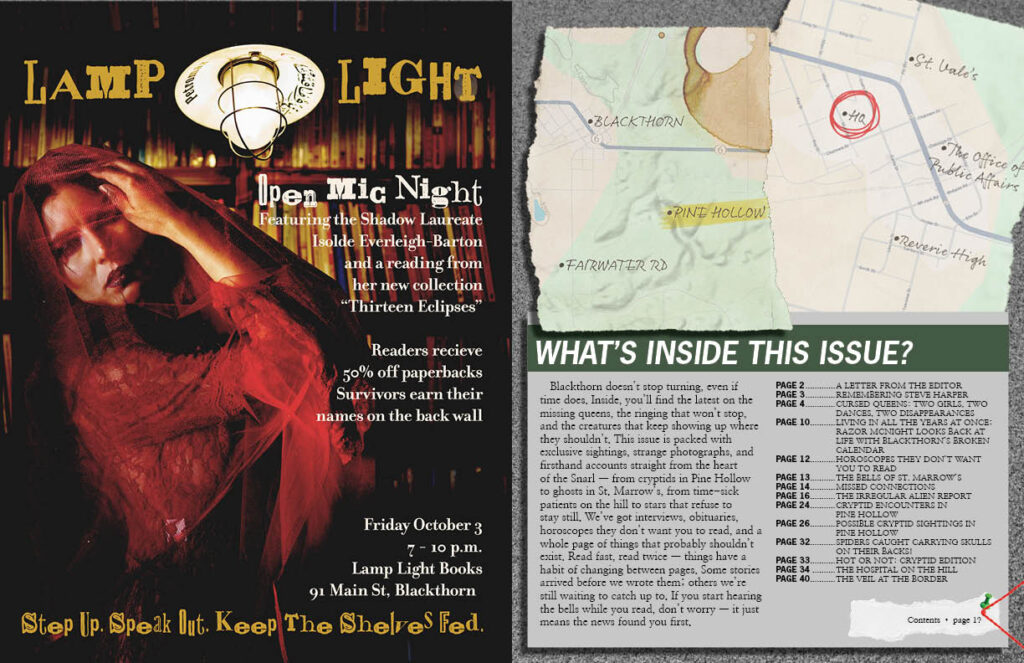 This piece is an excerpt from a larger group project (thus why the table of content lists content that isn’t shown). The prompt was to create the entirety of a magazine, and my group elected to create a small-town-horror news magazine. Based on classroom guidelines, all of the copy in this piece is AI-generated, but every visual except for the the two ads on the “Horoscopes” pages is human-made. I built the layouts and edited the photographs. I also drew all of the black, icon-like illustrations that make appearances on a few pages (like the doodle of Frank Callahan or the images for the Bells of St. Marrow’s).